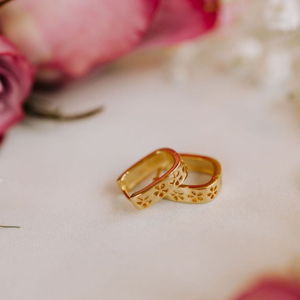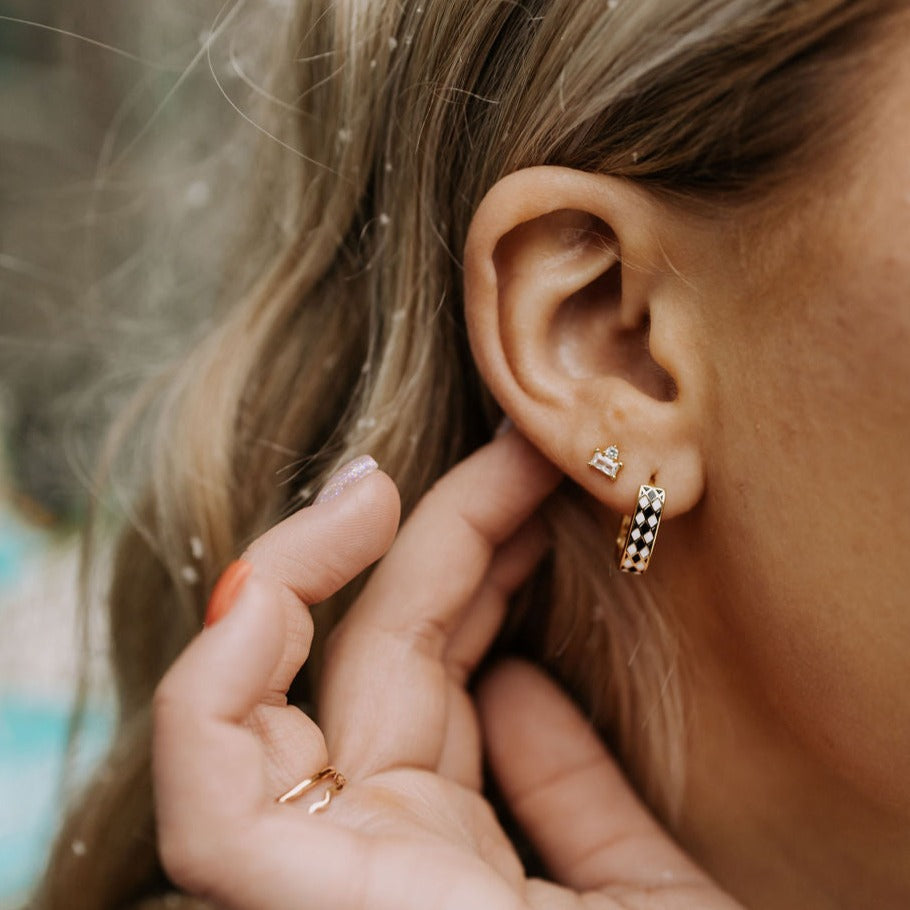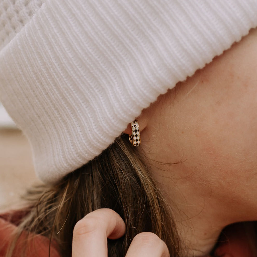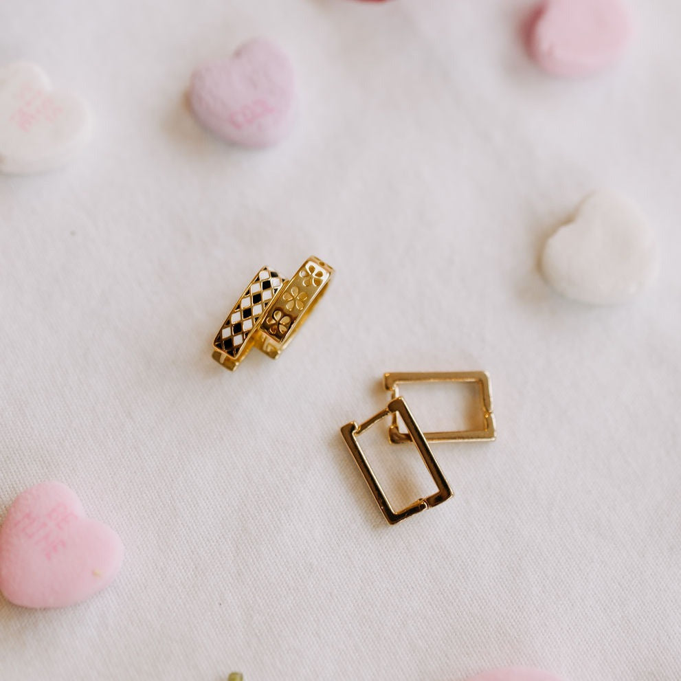 The Times Square Reversible Hoops are made of high quality gold vermeil metal and are hypoallergenic and good for sensitive ears. On the front side they feature a unique black and white diamond checker pattern, and on the other side feature a dainty gold cutout daisy pattern. They can be worn in either direction, meaning you get two earring styles for the price of one! Outer diameter is 10mm.